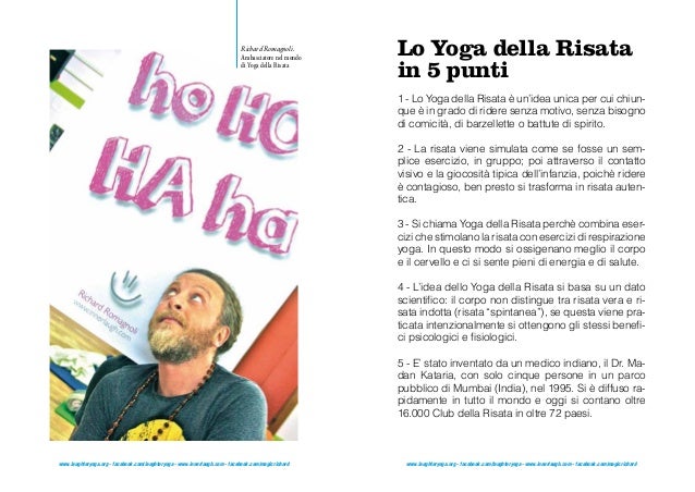 CLUB della RISATA è il nome che viene dato ad ogni gruppo che si riunisce per Ridere senza Motivo con lo Yoga della Risata Tale esercizio può essere fatto all’aperto, come nei parchi in India la mattina, oppure in luoghi chiusi (case, palestre, etc). Http//wwwnonsoloanimatv Conferenza di Richard Romagnoli sul tema "Ho imparato a ridere Il potere della Risata Interiore" (Milano, 15 gennaio 14) * *. Lo yoga della risata è una disciplina che insegna a ridere anche senza nessun motivo per farlo Nasce nel 1995 in India, da un’intuizione del dottore Madan Kataria e si diffonde rapidamente in tutto il mondo, anche grazie al lavoro dei cosiddetti ambasciatori dello yoga della risataOggi i club dello yoga della risata sono presenti in più di 70 stati ed hanno un seguito di milioni di.