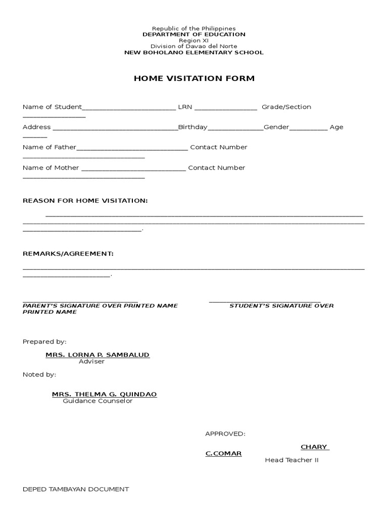 You can download home visit forms from the links below You need this form accomplished and approved by your school head before you conduct a home visit We also included call parent form just in case to invite parents to school to discuss matters regarding their children DOWNLOAD CALL PARENT AND HOME VISIT FORMS BELOW. PowerPoint DepEd Enrollment Guidelines for School Year 21 in Light of the COVID19 Pandemic;. HOME VISITATION Form Download HOME VISITATION Form Ma Carmen Naingue DOC Download Free PDF Free PDF Download PDF PDF PDF Download PDF Package PDF Premium PDF Package _____ School Principal DEPED TAMBAYAN DOCUMENT Related Papers Enhancing Collaboration Between Primary and Subspecialty Care Providers for Children and Youth with.