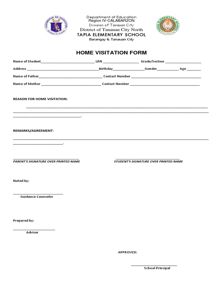Home visitation form deped. The Department of Education (DepEd) issued DepEd Order No 16, s – “Guidelines on Eligibility and Application for the Senior High School Voucher Program (SHS VP) for School Year (SY) –21” The said DepEd Order provides details on the requirements, procedure, and schedule for Read More. #DepEd Education #Homevisitation #NewNormal. Schedule a home visit 7 to 10 days in advance Communicate the purpose of your visit and approximately how long the visit will last (30 to 45 minutes) Follow up with a brief written note indicating the exact date and time of the meeting, preferably written in the family's home language.