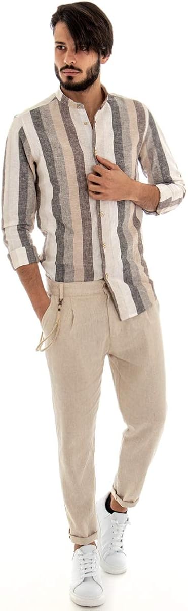 Outfit Uomo Completo Lino Camicia Collo Coreano Pantalone Rigato Beige Coulis Ebay