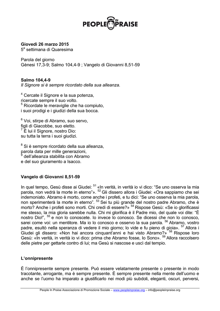 Nel cielo rendi stabile la tua fedeltà» 4 «Ho stretto un’alleanza con il mio eletto, ho giurato a Davide, mio servo. Avr 16 Cette épingle a été découverte par Mikelo Gulhe Découvrez vos propres épingles sur et enregistrezles. People in Praise Menu Lunedì 23 Marzo Fourth Week of Lent Word for today Questa sezione presenta quotidianamente il Vangelo del Giorno accompagnato da una riflessione, insieme all'antifona e al Salmo corrispondente, che in alcuni particolari periodi dell’anno liturgico potranno essere musicati e cantati che in alcuni.