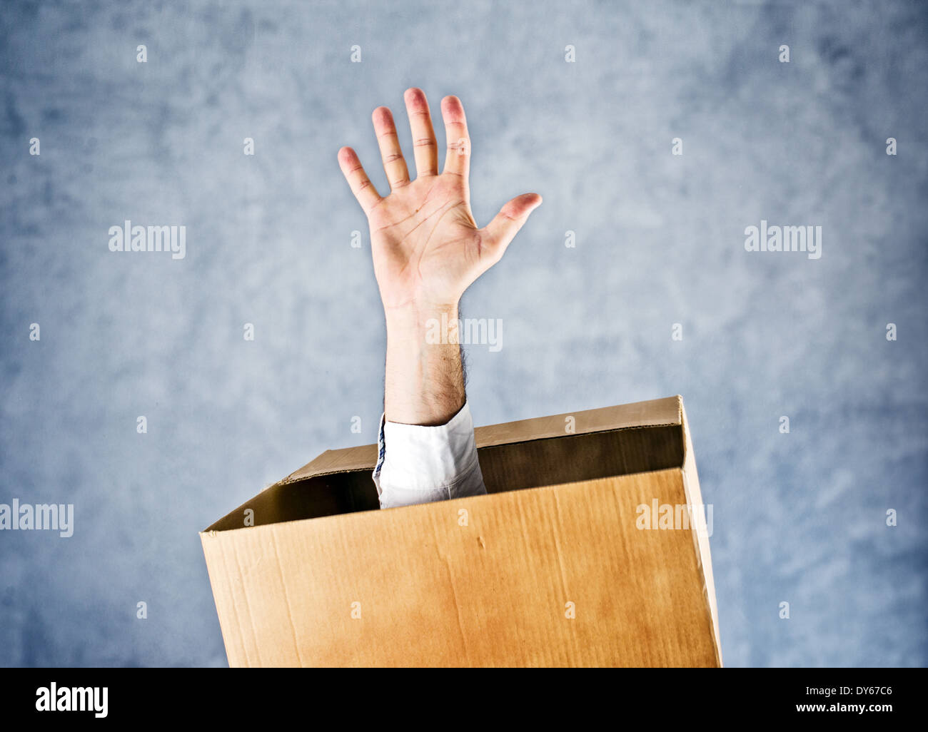 Maschio Lato Raggiungendo Fuori Dalla Scatola Di Cartone La Richiesta Di Aiuto E Di Salvezza Foto Stock Alamy