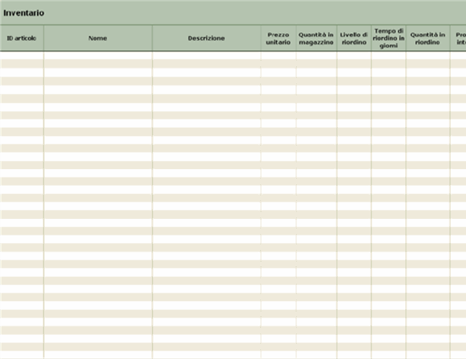 Inventario magazzino come fare?. Inventario delle attrezzature Con questo modello accessibile è possibile tenere traccia delle condizioni fisiche e della situazione finanziaria delle attrezzature dell'azienda Basta registrare il modello e il numero di serie, le informazioni relative all'acquisto e i costi di gestione l'ammortamento verrà calcolato automaticamente. Come fare un foglio di inventario Se si desidera un modo per abitudine fare un foglio di inventario, Microsoft Excel lavorerà per voi Excel è un foglio di calcolo che consente di creare una pagina separata per ogni prodotto che vendi Pagine possono essere impostare per calcolare i totali per settimana, mese e anno.
