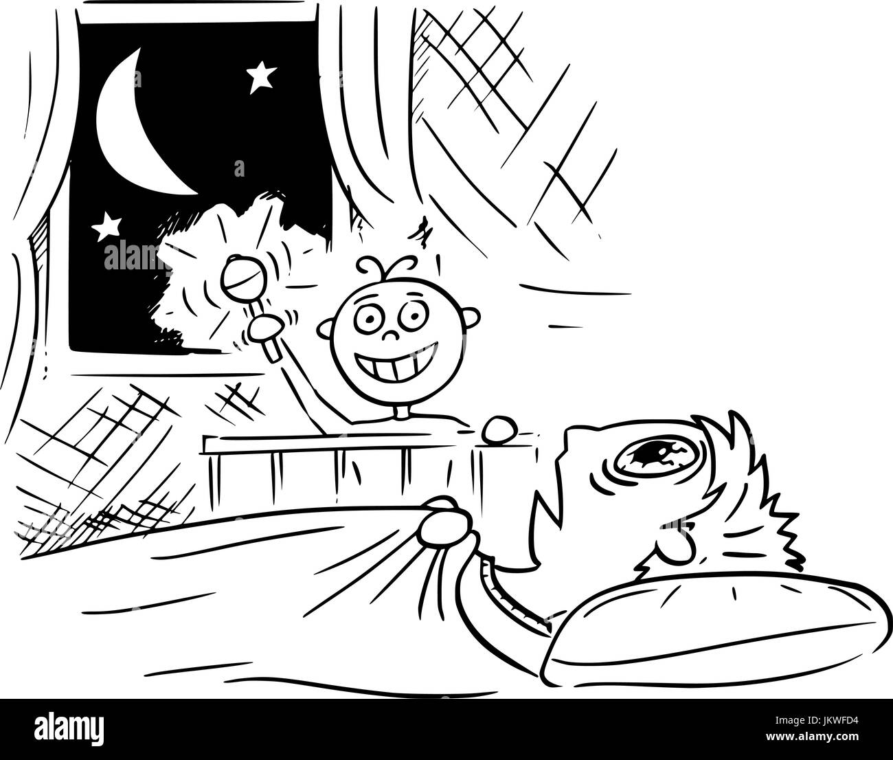 Disegno A Mano Cartoon Illustrazione Vettoriale Di Baby Non Dormire E Fare Rumore La Notte E La Madre O Il Padre Giacente Mortale Stanco A Letto E Non Sono In Grado Di