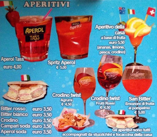 Benvenuto nel cuore della nostra realtà, cuore che coniuga il piacere della scoperta con quella del gusto Da questo momento potrai scegliere le combinazioni perfette per il tuo aperitivo ideale da gustare dove ti è più comodo a casa, in ufficio o da amici in totale relax. C’è l’imbarazzo della scelta anche tra i cocktail da aperitivo Spritz Aperol o Campari, Negroni, Negroni Sbagliato, Americano, Spritz Hugo, o Martini Molti si possono preparare in casa, seguendo i consigli di cinque bartender oppure attingendo alle ricette più casalinghe dei lettori de Il Giornale del Cibo. If you prefer drinks without alcohol, every Italian bar will have their own option to offer (Aperetivo analcolico della casa) Normally it would be a variety of sodas or mixes of fruit juices At home, you can even prepare a simple lemonade by blending lemons with water and sweetener of your choice.