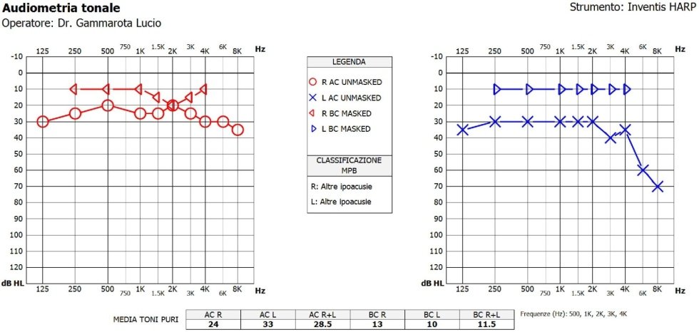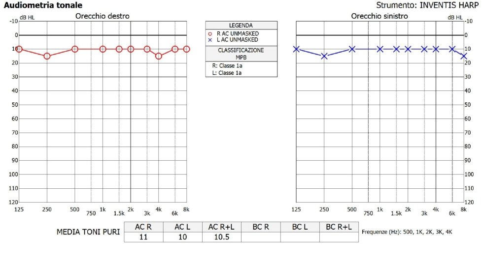 Audiogramma tonale N ella fase della misurazione dell’udito indosserete le cuffie e premerete il pulsante ogni volta che sentirete il suono Le orecchie saranno misurate separatamente Questo test ci aiutera a compilare l’audiogramma tonale, che riporta in dettaglio il tipo e il grado della perdita dell’udito. L’audiogramma tonale permette di effettuare una valutazione soggettiva della capacità uditiva di un soggetto Un audiogramma è un grafico che rappresenta la capacità uditiva sulla base dei risultati di un test Viene registrata la soglia di udibilità per le diverse frequenze, la quale indica il livello minimo di percezione uditiva del. Nell’audiogramma tonale i criteri seguenti sono adempiuti cumulativamente • soglia uditiva a 500 e 1000 Hz > 40 dB • soglia uditiva a 2 kHz ≤ 30 dB • aumento della soglia uditiva.