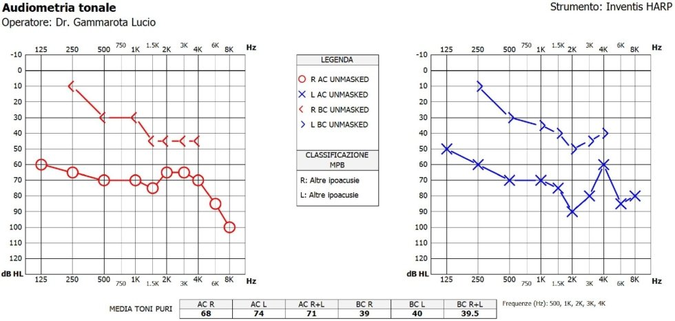 Il suo audiogramma tonale riporta un'ipoacusia trasmissiva bilaterale la soglia audiometrica per via ossea è normale l'orecchio interno funziona, mentre la soglia per via aerea è più alta (la curva più in basso) – l'orecchio medio non funziona bene.