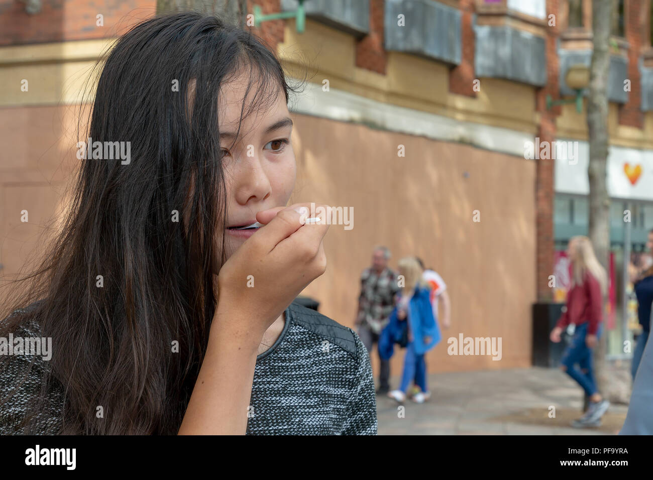 Inglese Thai Ragazza Adolescente Con Lunghi Capelli Neri Mangia Una Granita Blu Nel Centro Citta Di Warrington Foto Stock Alamy