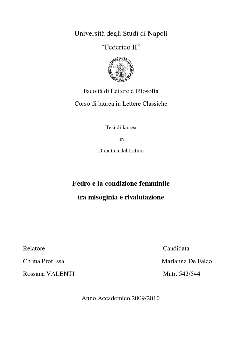 Universita Degli Studi Di Napoli Federico Ii Facolta Di Lettere E Filosofia Corso Di Laurea In Lettere Classiche Tesi Di Laurea In Didattica Del Latino Fedro E La Condizione Femminile Tra