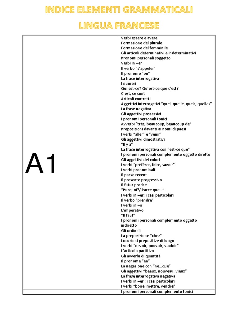 Elenco Argomenti Grammaticali Francesi Divisi Per Livello A1 B1