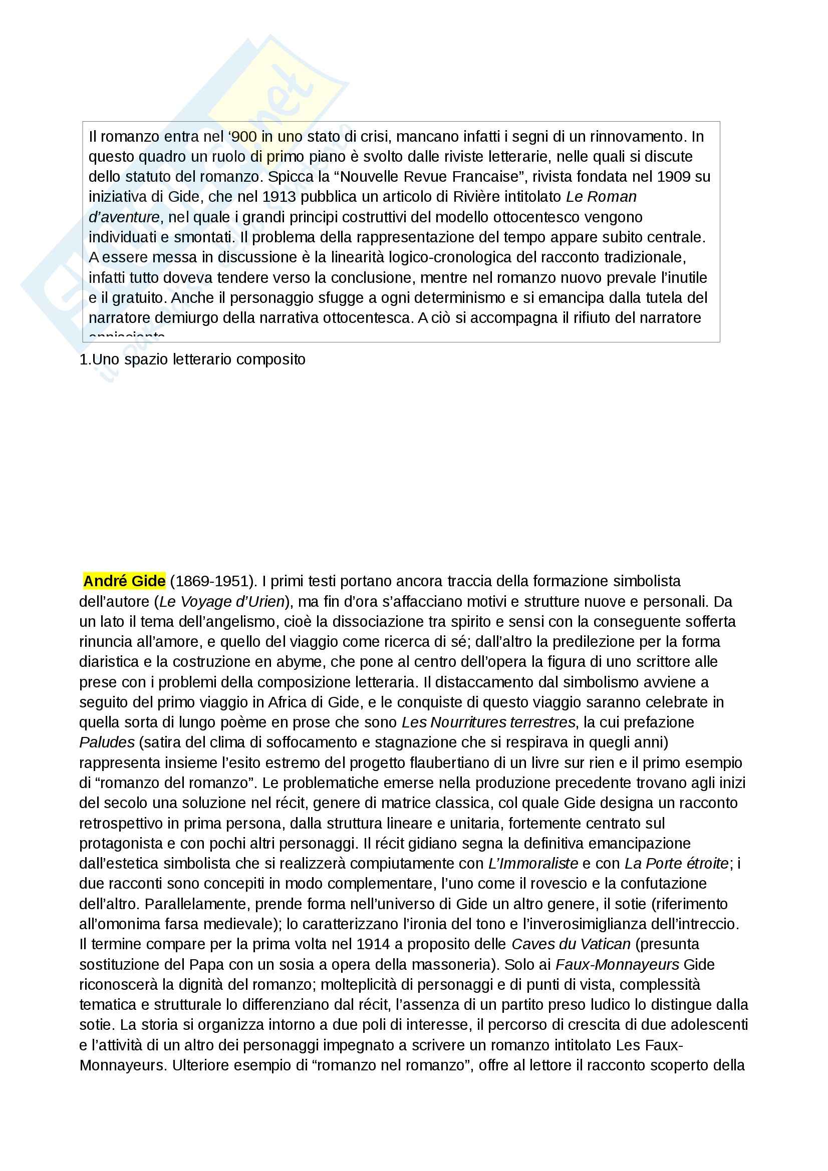 Il Romanzo Francese Del 900 Novecento Letteratura Francese Teroni Docsity
