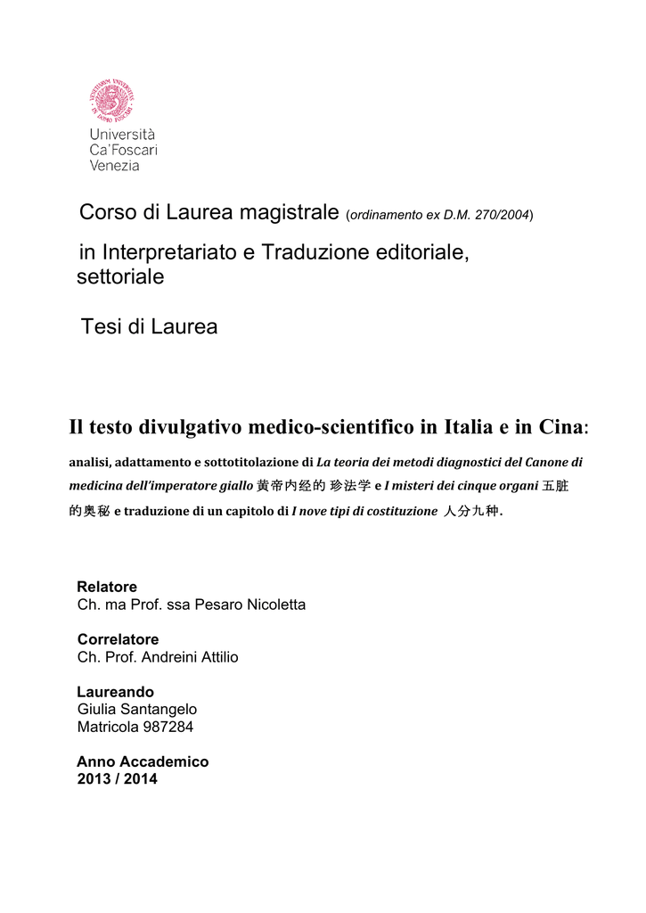 Il Corso di laurea magistrale prevede la formazione di una figura professionale con elevate competenze traduttive, con particolare riferimento ai linguaggi specialistici (tecnologico, giuridico, economico, commerciale, medicofarmacologico, informatico, della multimedialità e altro) nonché competenze in ambito terminologico e terminografico, e conoscenze del mondo editoriale, sulla base di. Corso di Laurea Magistrale in Interpretariato e Traduzione Editoriale e Settoriale Tesi di Laurea Femminismo sviluppo di una coscienza femminile attraverso i libri di Li Ang Traduzione di due articoli in cinese sulla coscienza femminile in Li Ang Relatore Ch Prof Paolo Magagnin Correlatore Ch ma Prof ssa Federica Passi Laureando. Corsi di laurea magistrale;.