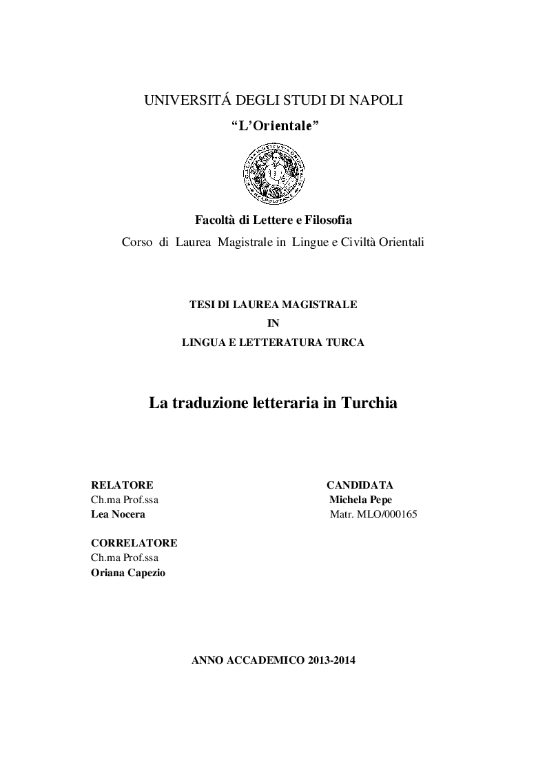 Universita Degli Studi Di Napoli L Orientale Facolta Di Lettere E Filosofia Corso Di Laurea Magistrale In Lingue E Civilta Orientali Tesi Di Laurea Magistrale In Lingua E Letteratura Turca La Traduzione Letteraria