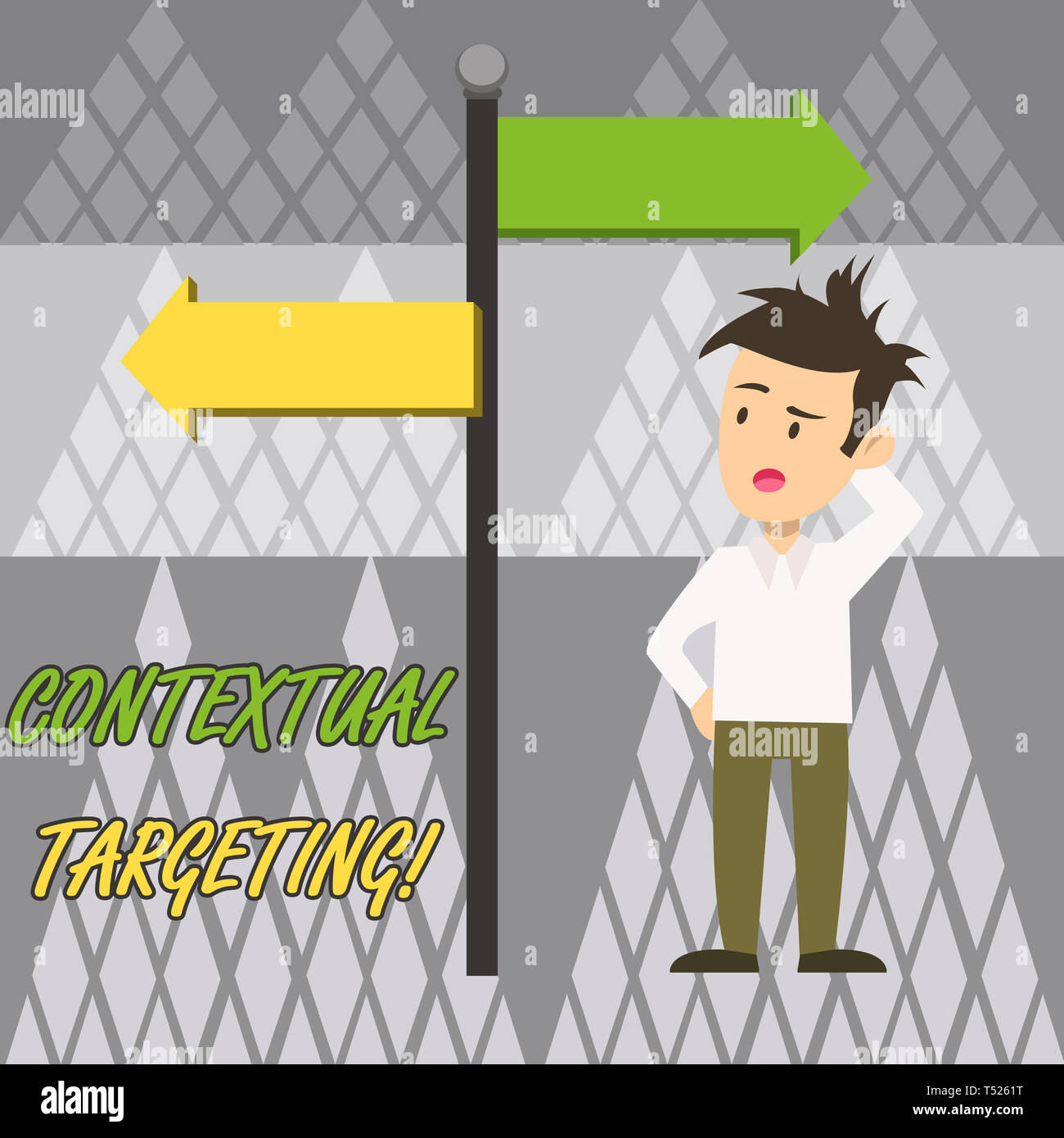Segno Di Testo Che Mostra Il Targeting Contestuale Business Photo Testo Pubblicita Mirata Per Gli Annunci Che Appaiono Sui Siti Web Uomo Confuso Con Il Cartello Stradale Freccia P Foto Stock