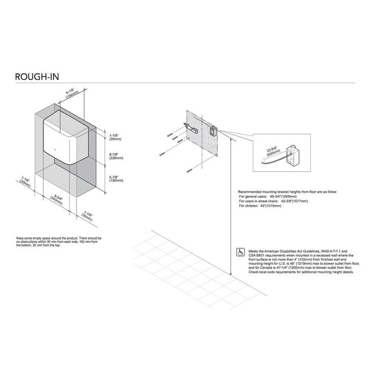 1 If hardwired, disconnect power source of electricity previously bought to the hand dryer location 2 Be sure there is no obstruction between floor and dryer If mounted over counter top place dryer no less than 16 inches above counter Do not install dryer over wash basin 3 Mark wall at appropriate mounting height according to height guide below. Suggested handsin dryer height relative to age range Males (adult) 1,040mm Females (adult) 980mm Children (all ages) 0mm Disabled users 0mm These measurements are taken from the top of the dryer unit to the floor With having only 3040 hands in dryers, picking the right one is much easier. To comply with the Americans with Disabilities Act guidelines, all automatic hand dryers must be installed at a height no less than 27 inches from the floor and cannot protrude more than 4 from the wall or the recessed space.