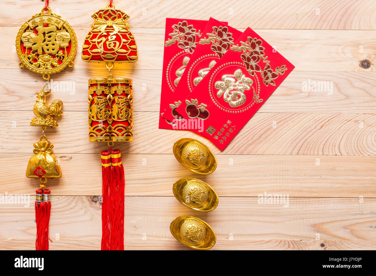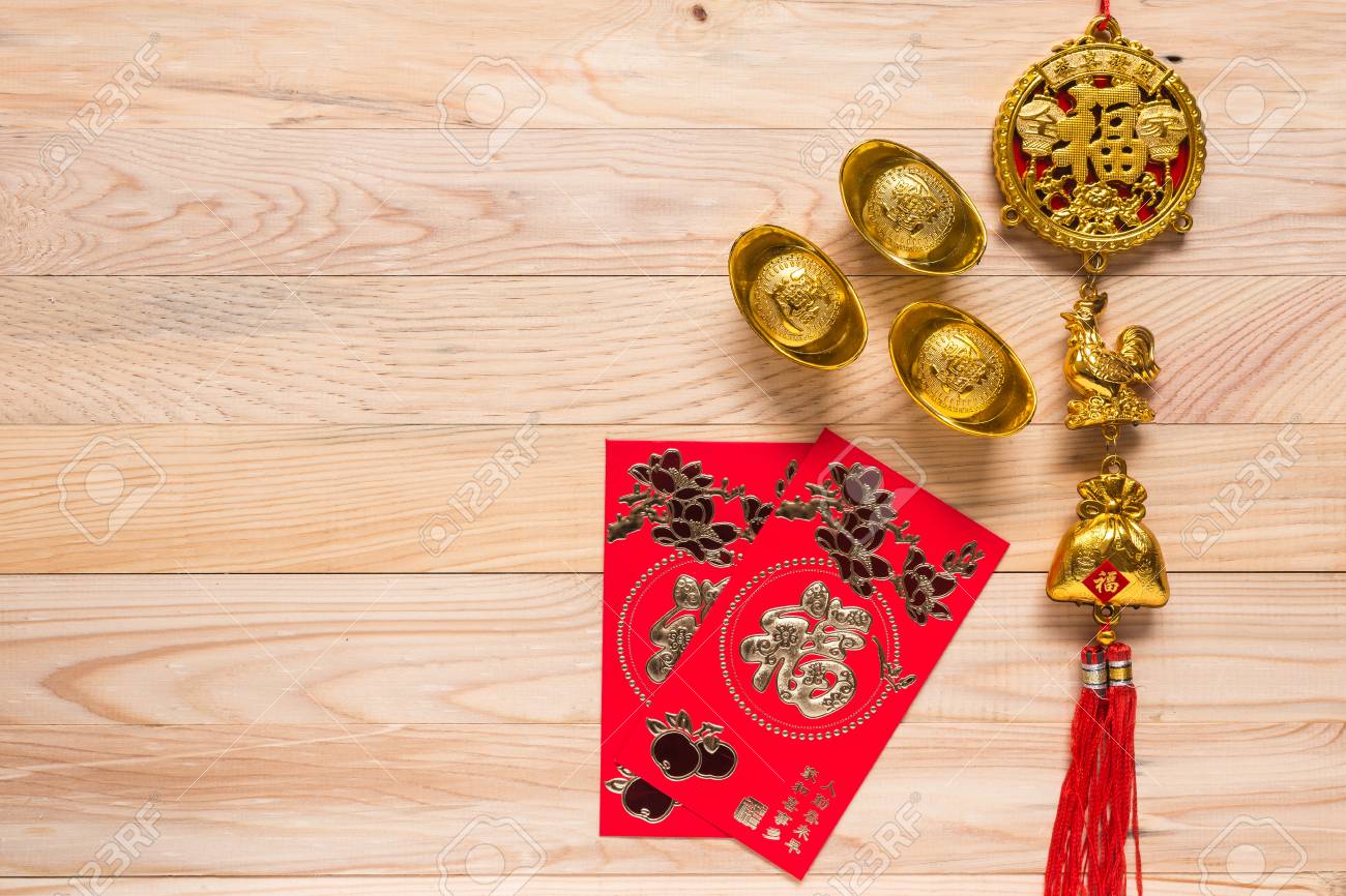 Vista Superiore Oro E Rosso Per Il Nuovo Anno Cinese Di Decorazione Su Sfondo Di Legno Traduzione In Inglese Significato Fortunato E Riccamente Foto Stock Alamy