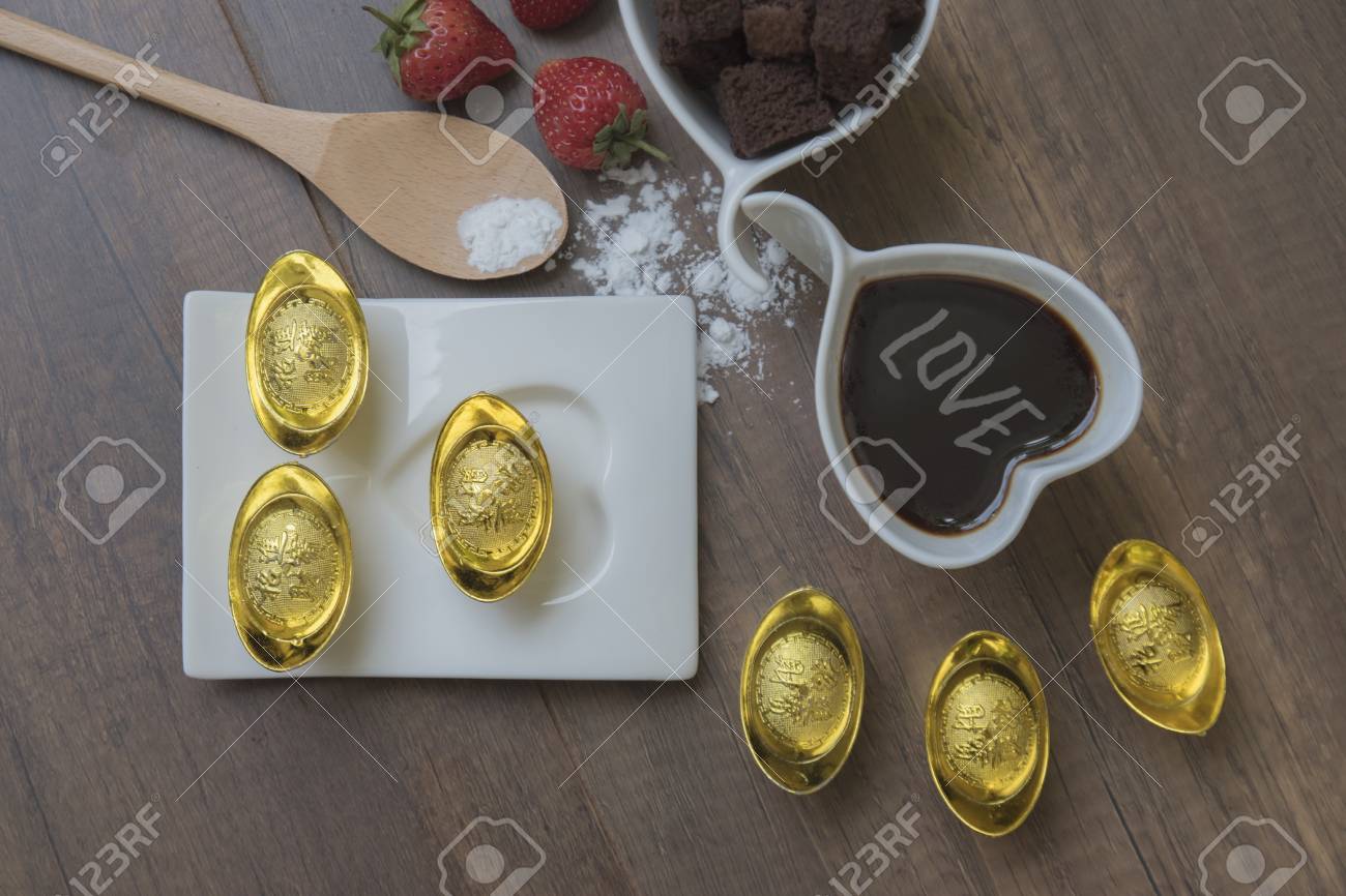 Immagini Stock Traduzione In Inglese Che Significa Fragola D Oro Fortunata E Ricca Di Caffe Su Legno Image