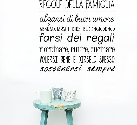Le regole in famiglia sono necessarie per condividere in serenità i momenti insieme Quelle proposte dal nostro wallsticker sono semplici e renderanno più piacevole ogni istante trascorso in famiglia Alzarsi di buonumore, abbracciarci e dirsi buongiorno, farsi i regali, organizzare le vacanze ma soprattutto volersi bene e dirselo spesso. Regole per lo più trasgredite, non rispettate, ignorate Ce ne parlano genitori preoccupati e se ne lamentano maestre disperate alle prese con classi “ingestibili”;. Permettete a vostro figlio adolescente di esprimere la propria opinione sulle regole che stabilite per la famiglia Per esempio, se vi chiede di spostare l’ora del rientro a casa, ascoltate ciò che ha da dire Se sa che lo avete ascoltato attentamente, è più probabile che rispetti la decisione che prenderete, anche se non la condivide.