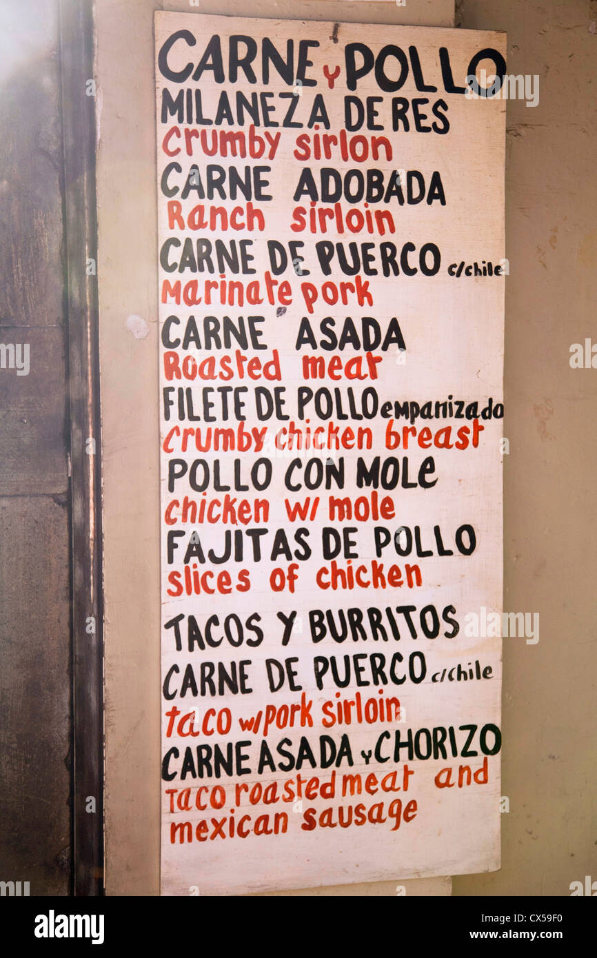 Esegui il download di questa immagine stock Menu in spagnolo e in inglese sulla parete presso il ristorante El Patio nel lago Chapala, Jalisco, Messico BGYT02 dalla libreria Alamy di milioni di fotografie, illustrazioni e vettoriali stock ad alta risoluzione. Puoi cercare tra più di foto royalty free, filmati, video digitali, immagini clip art vector, fotografie clipart, sfondi grafici, illustrazioni mediche. Spagnolo è scritto in alfabeto latino, a cui si aggiunge una caratteristica ñ Pronuncia spagnolo non è complicato Spelling è fonetica, il che significa che lo spagnolo è letta come è scritto L'accento è sulla ultima o penultima sillaba Noun modula periphrastic Molte parole di origine indiana in Sudamericana Spagnola spostati in.
