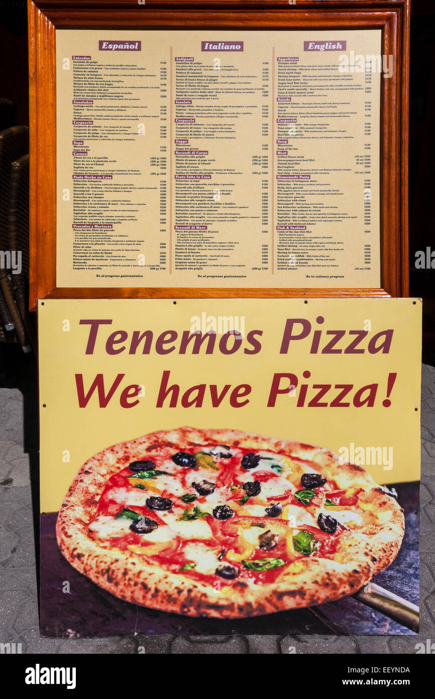 Restaurant Sign E Menu In Spagnolo Italiano E Inglese Annunciando La Pizza Playa Del Carmen E Riviera Maya Yucatan Messico Foto Stock Alamy