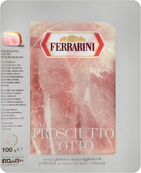 Una porzione di prosciutto apporta anche una discreta quantità di sali minerali potassio, calcio e fosforo e mantiene anche una discreta quota di vitamine B Il prosciutto cotto è anche ricco. Il Prosciutto Cotto Ferrarini si adatta alle esigenze degli italiani da oltre sessant’anni è un Prosciutto Cotto senza glutine, senza polifosfati aggiunti, senza proteine del latte e lattosio Ideale per chi desidera seguire una alimentazione sana ed equilibrata senza mai rinunciare a quel gusto unico. Prosciutto Cotto Alta Qualità, senza glutine, senza acqua aggiunta, senza polifosfati aggiunti, senza derivati del latte e senza glutammato aggiunto.