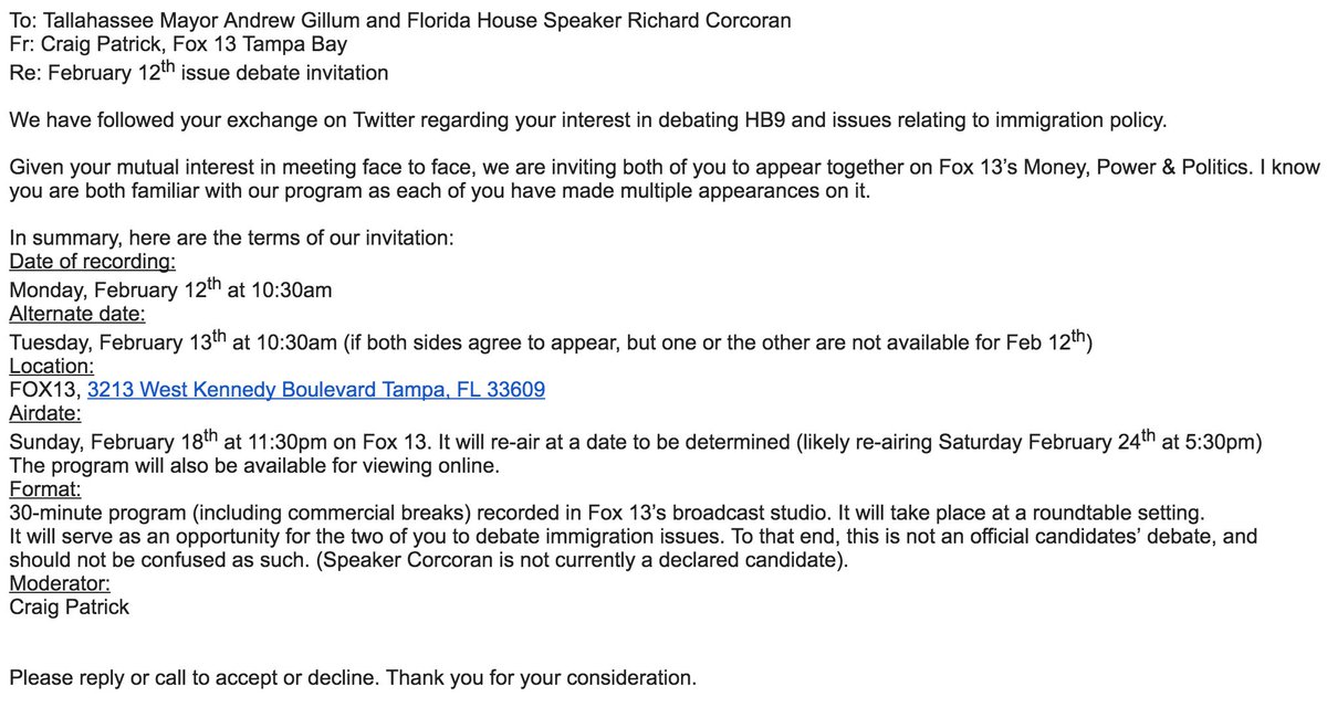 Richard Corcoran I Am Looking Forward To Joining Andrewgillum For A Televised Debate On My Push To Ban Sanctuary Cities In Florida Thank You Fox13politics For The Offer Flapol T Co V2crqr6f2z