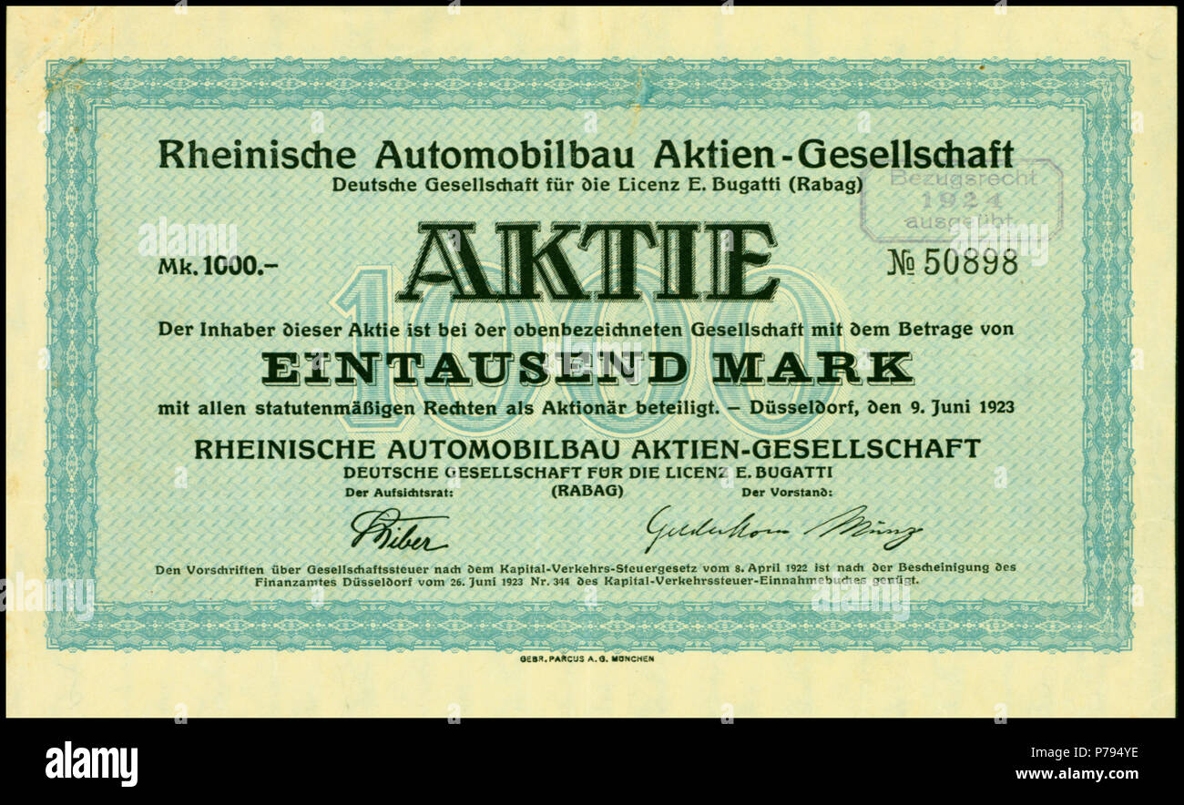 Inglese Quota Di Rheinische Automobilbau Ag Rilasciato 9 Giugno 1923 Deutsch Aktie Uber 1000 Mark Der Rheinische Automobilbau Ag Vom 9 Juni 1923 9 Giugno 1923 6 Rheinische Automobilbau Ag 1923 1000 Mk Foto Stock Alamy