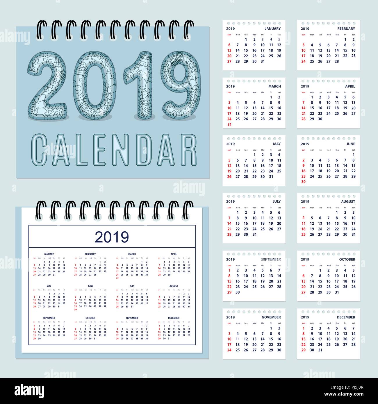 Americano Classico Calendario Da Parete 19 Con Zen Groviglio Modellato Visual Tridimensionale Di Numero 19 La Lingua Inglese Settimana Comincia La Domenica Immagine E Vettoriale Alamy
