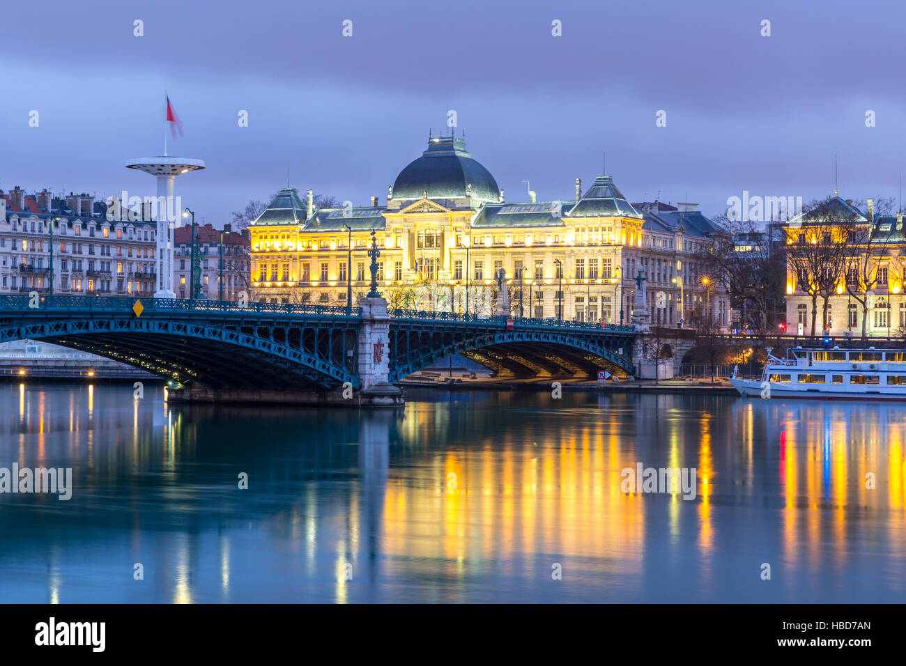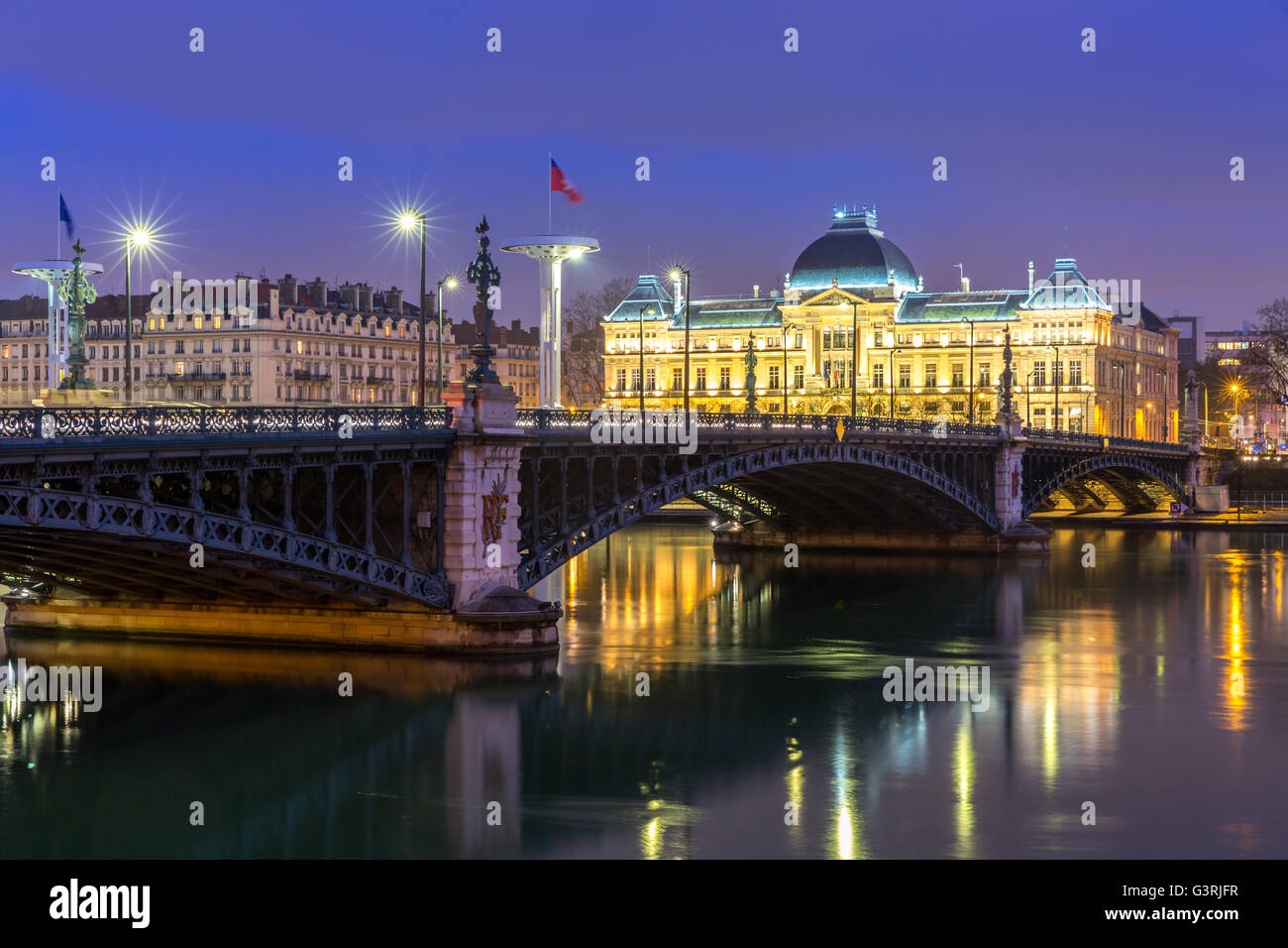 Universita Di Lione Ponte Lungo Rhone River Di Notte A Lione Francia Foto Stock Alamy