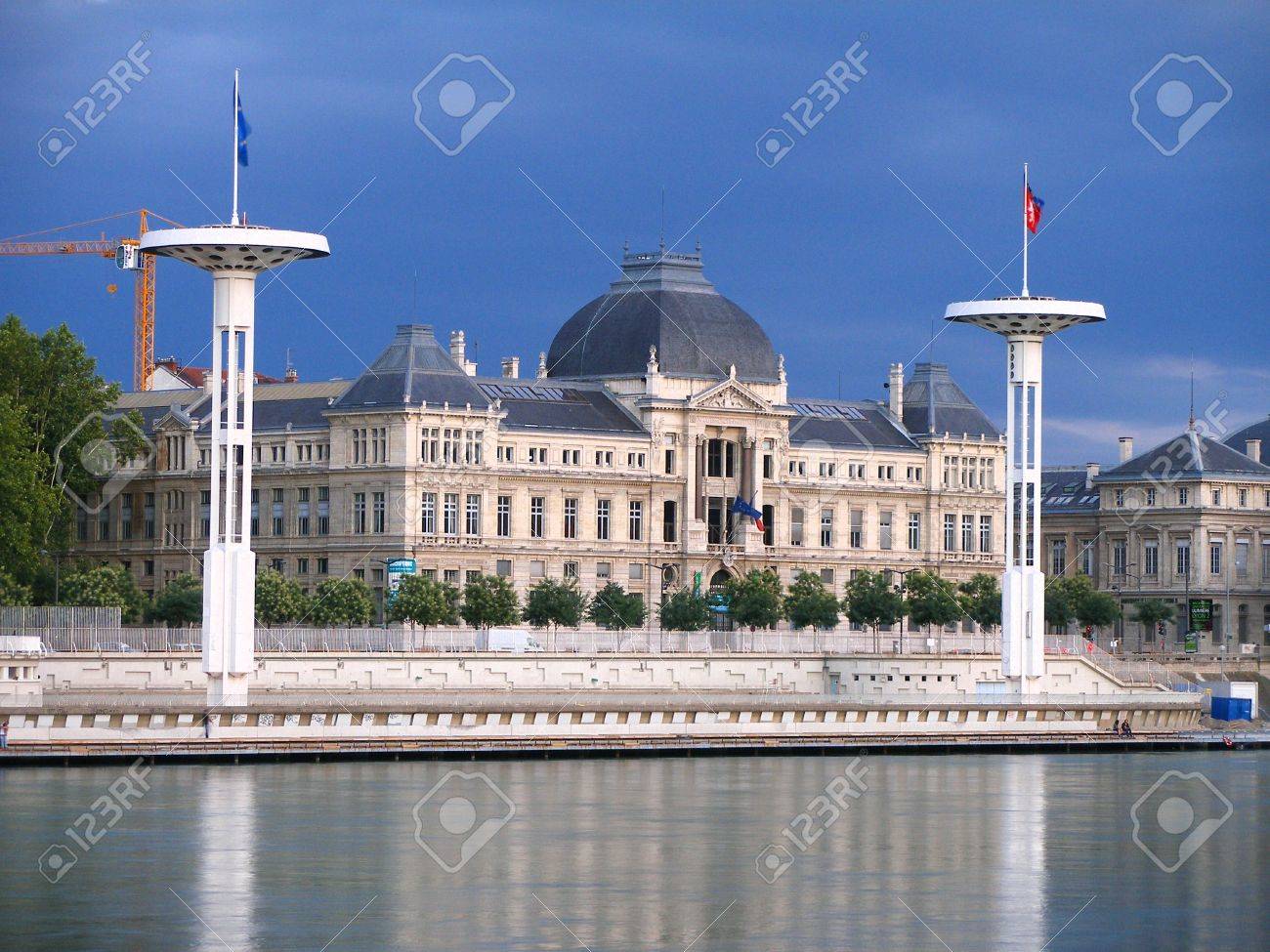 Asta Della Bandiera Con La Bandiera Della Citta Di Lione Nella Parte Anteriore Dell Universita Di Lione Immagine Editoriale Immagine Di Bandiera Parte