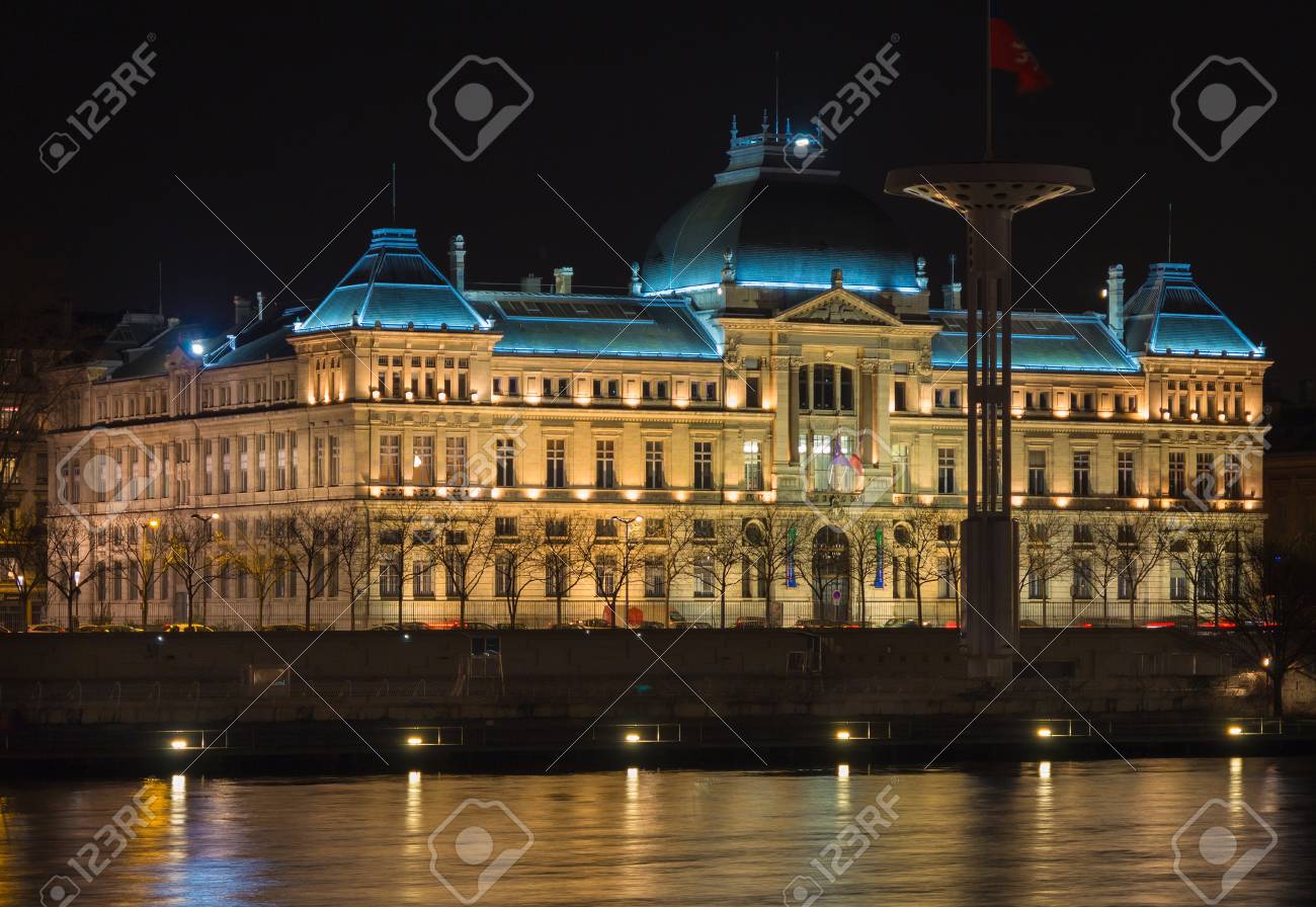 Immagini Stock Universita Di Lione Che Costruisce Vicino Al Ponte Lungo Il Fiume Rodano Alla Notte A Lione Francia Image