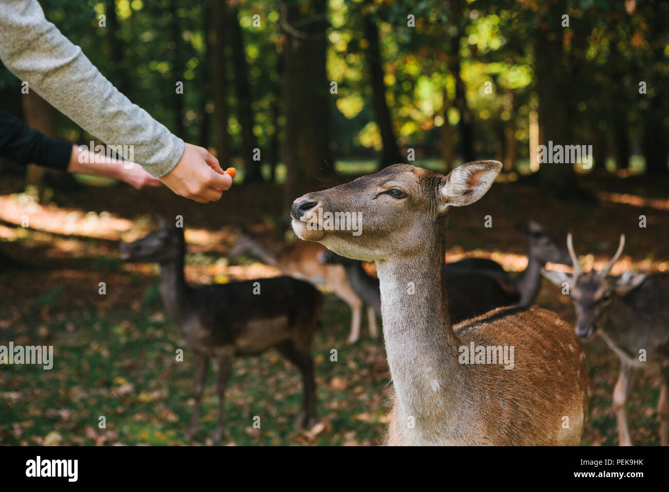 People Feed A Group Of Deer In The Forest Caring For Animals Stock Photo Alamy