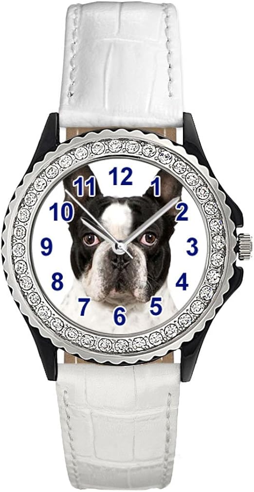 Bulldog Francese Orologio Da Polso Da Donna Strass Cinturino In Pelle Bianco Amazon It Orologi