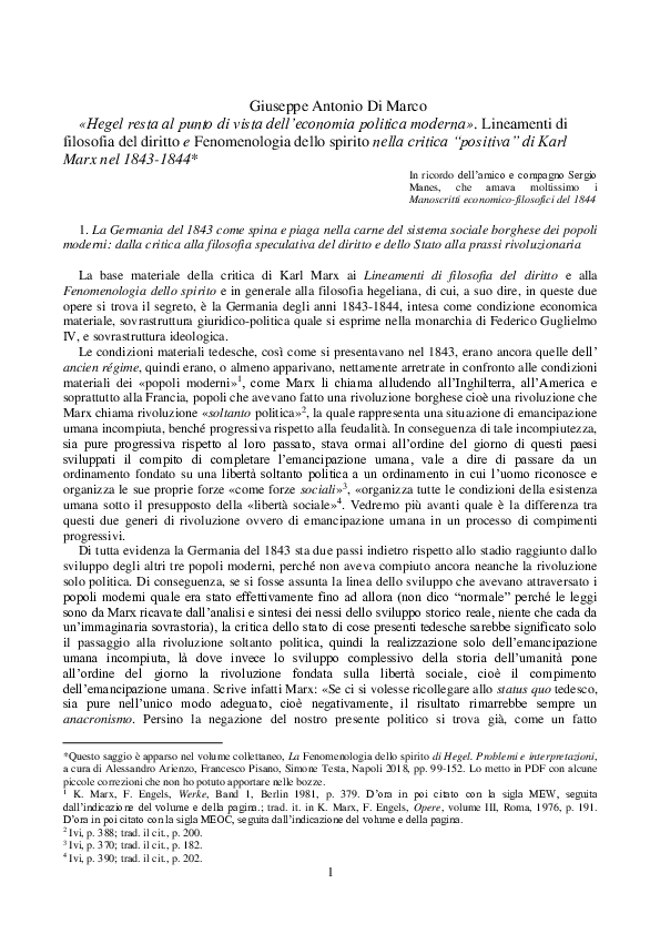 Pdf Hegel Resta Al Punto Di Vista Dell Economia Politica Moderna Lineamenti Di Filosofia Del Diritto E Fenomenologia Dello Spirito Nella Critica Positiva Di Karl Marx Nel 1843 1844 Pdf Giuseppe Antonio Di Marco