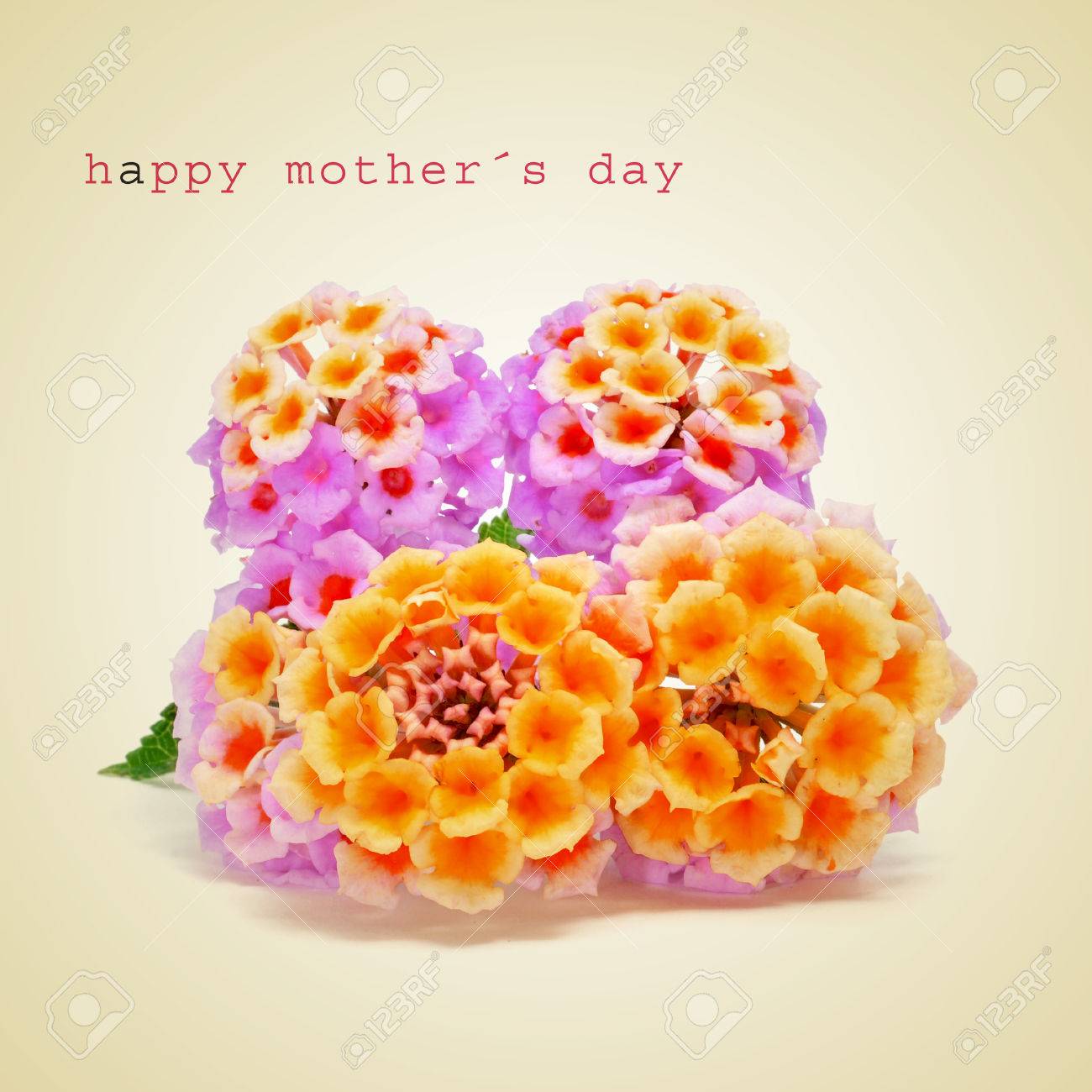 Immagini Stock Un Mazzo Di Fiori Di Verbena E Il Giorno Di Madri Felice Di Frase Su Un Beige Con Un Effetto Retro Image