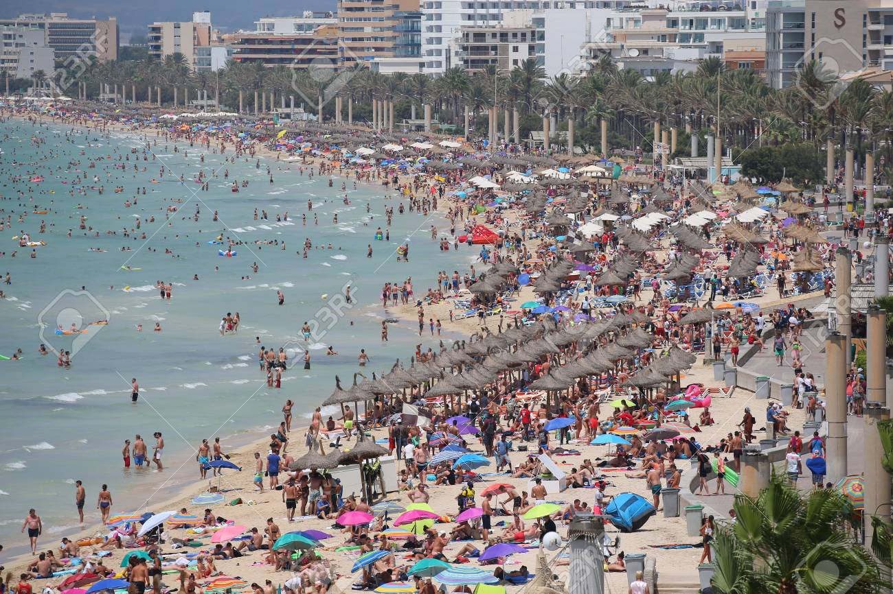S Arenal Beach With Palm Trees And Sunbathing People El Arenal Is A Tourist Town On The Island Of Mallorca Majorca In Spain Editorial Photo Image Of Balearic Shore