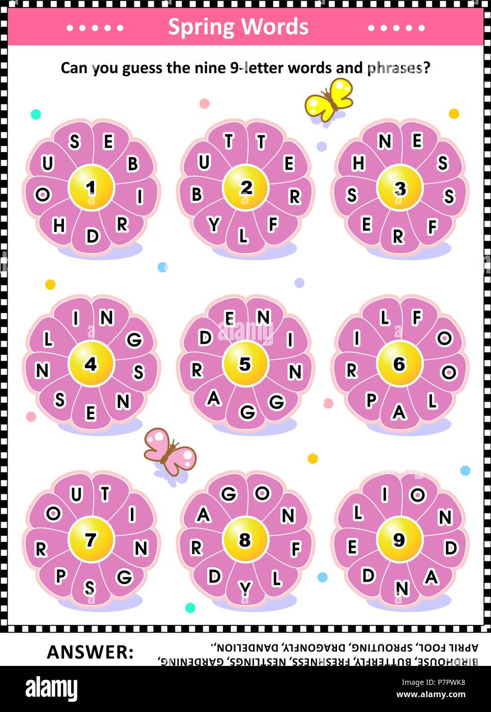 Gioco Di Parole Di Tema Della Primavera Con 9 Parole Della Lettera Sui Petali Del Fiore Illustrazione Vettoriale Illustrazione Di Aprile Pagine