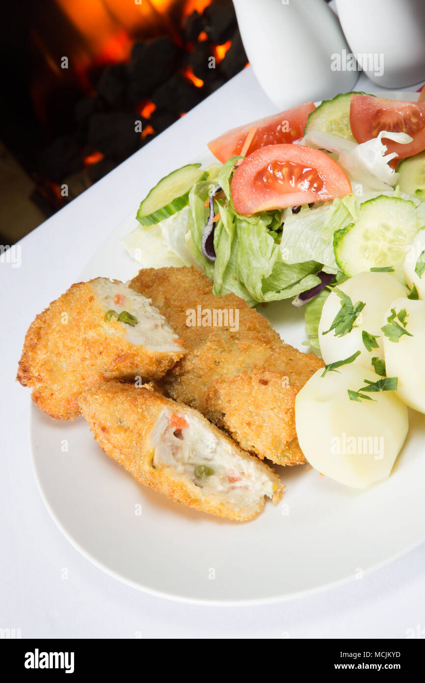 Un Pub Inglese Pasto Di Profondo Fritto Di Pollo Impanato E Polpette Di Verdure Con Patate Lesse E Insalata Mista Foto Stock Alamy