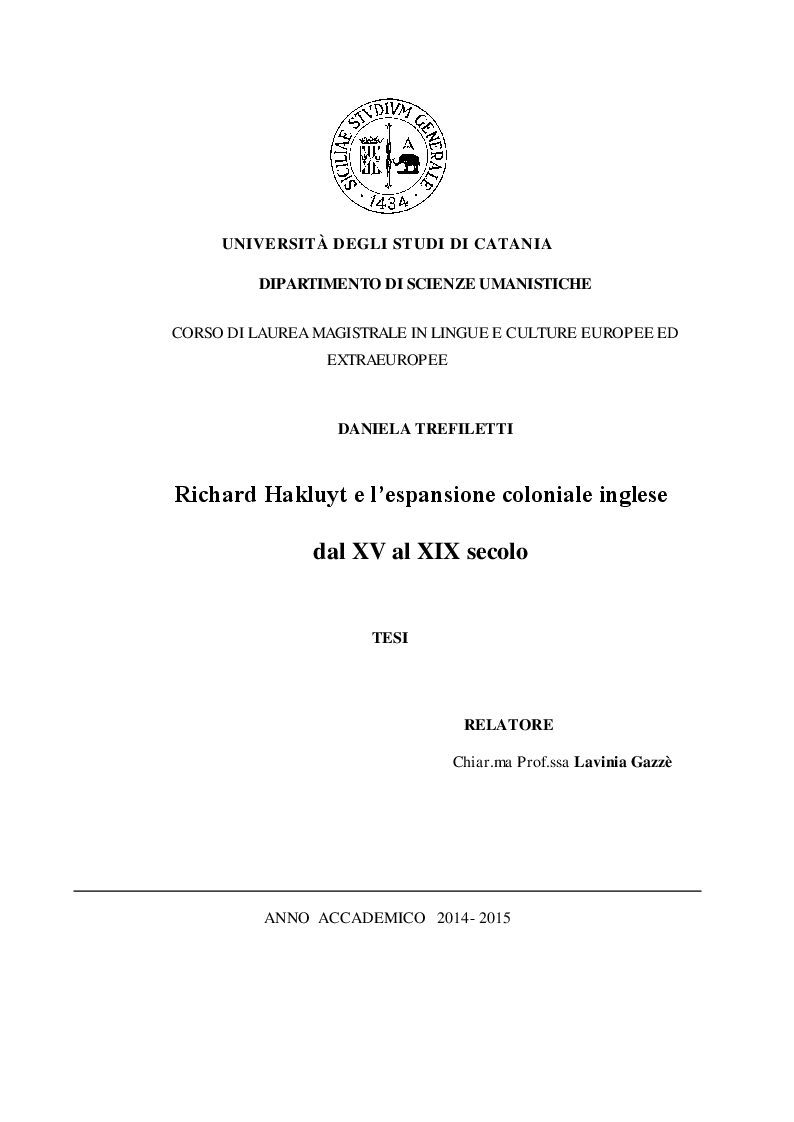 Universita Degli Studi Di Catania Dipartimento Di Scienze Umanistiche Corso Di Laurea Magistrale In Lingue E Culture Europee Ed Extraeuropee Daniela Trefiletti Richard Hakluyt E L Espansione Coloniale Inglese Dal Xv Al Xix