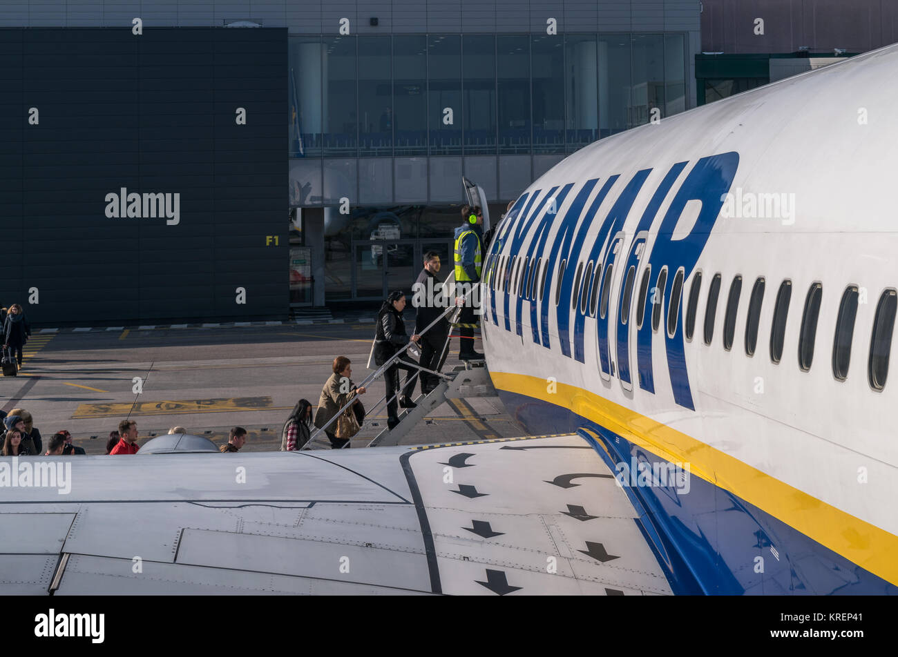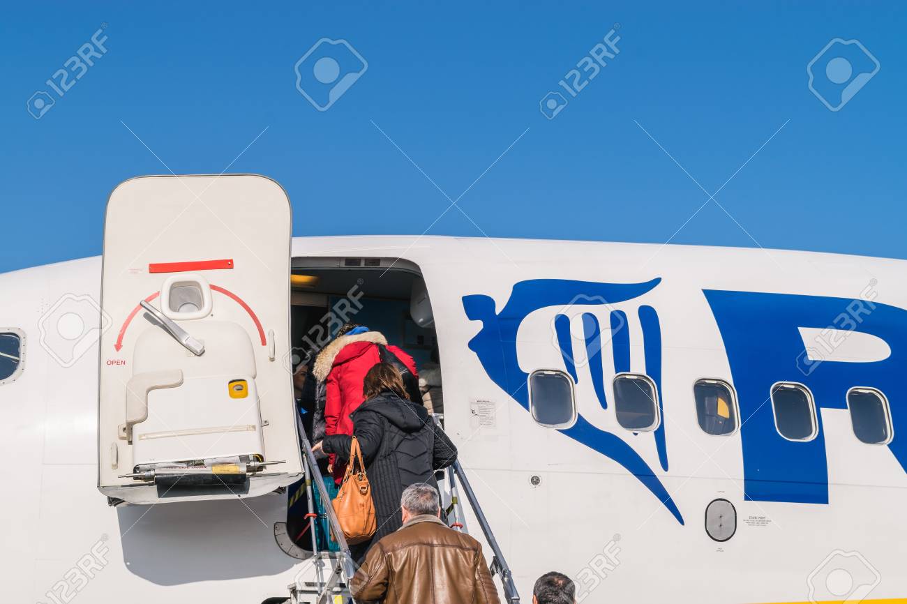 Immagini Stock Bologna Italia Febbraio 16 Passeggeri Che Si Imbarcano Su Ryanair Jetliner All Aeroporto Di Bologna Italia A Bucarest Romania Ryanair Ltd E Una Compagnia Aerea Low Cost Irlandese Con