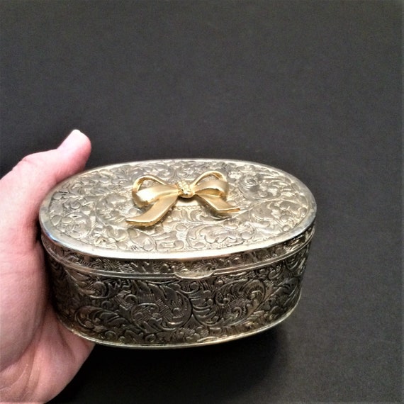 Vintage Silver Plate Trinket Box Embossed Metal Treasure Etsy