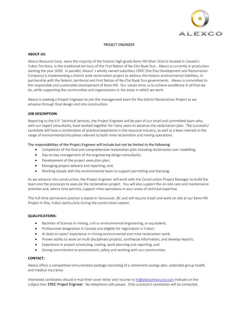 Job Opportunity With Alexco Resource Corp Project Engineer First Nation Of Na Cho Nyak Dun