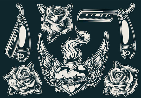 Vintage Monochrome Tattoos Composition With Straight Razors Roses Fiery Winged Heart In Barbed Wire Isolated Vector Illustration Tasmeemme Com