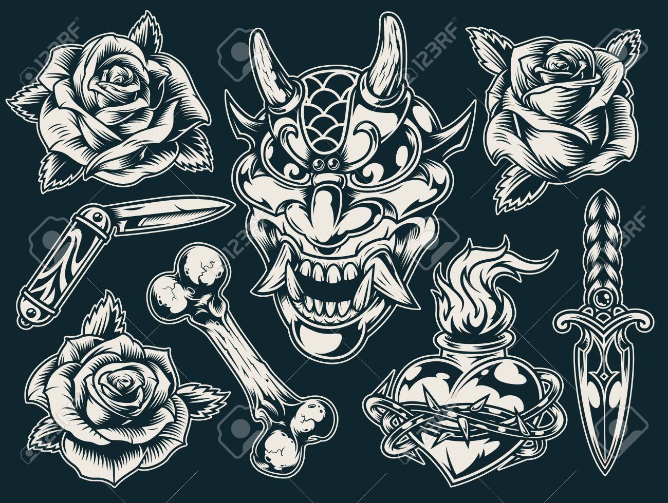 Vintage Flash Tattoos Monochrome Set With Devil Head Beautiful Royalty Free Cliparts Vectors And Stock Illustration Image