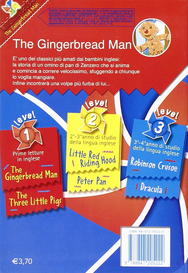 Made by the kids in class, he gets lonely during recess time and sets off to find out where his new friends have gone Running as fast as he can, he goes from the gym to the nurse's office to the cafeteria and ultimately ends up in the principal's office, with a few bumps and crumbles along the way. The Gingerbread man è una storia tradizionale inglese, che viene letta ai bambini nel periodo natalizio Parla della fuga del Gingerbread Man dalla casa dove è stato cucinato Durante la fuga incontrerà vari personaggi che cercheranno di mangiarlo Mi fermo qui, non voglio rovinarvi il finale!. I libri sono facili da leggere, in un inglese naturale Sono splendidamente illustrati a colori da artisti di tutto il mondo Includono letture audio online gratuite di madrelingua sia in inglese britannico che in inglese americano Ci sono attività divertenti e elenchi di parole utili dopo la storia in ogni libro.