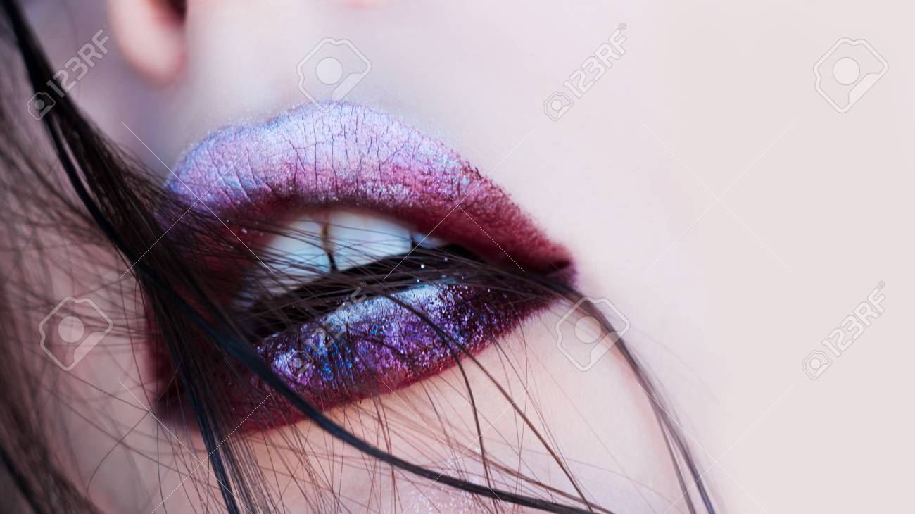 Immagini Stock Labbra Trucco Artistico Con Ombre E Lucentezza Close Up Piccola Profondita Di Campo Spazio Libero A Destra Image