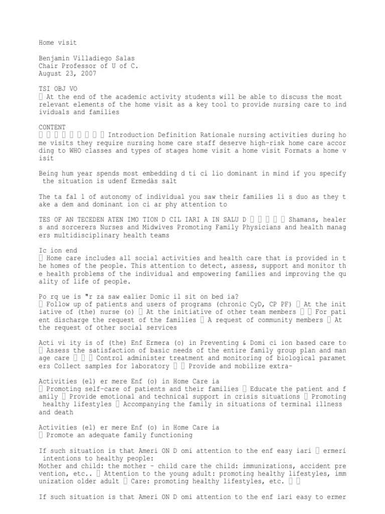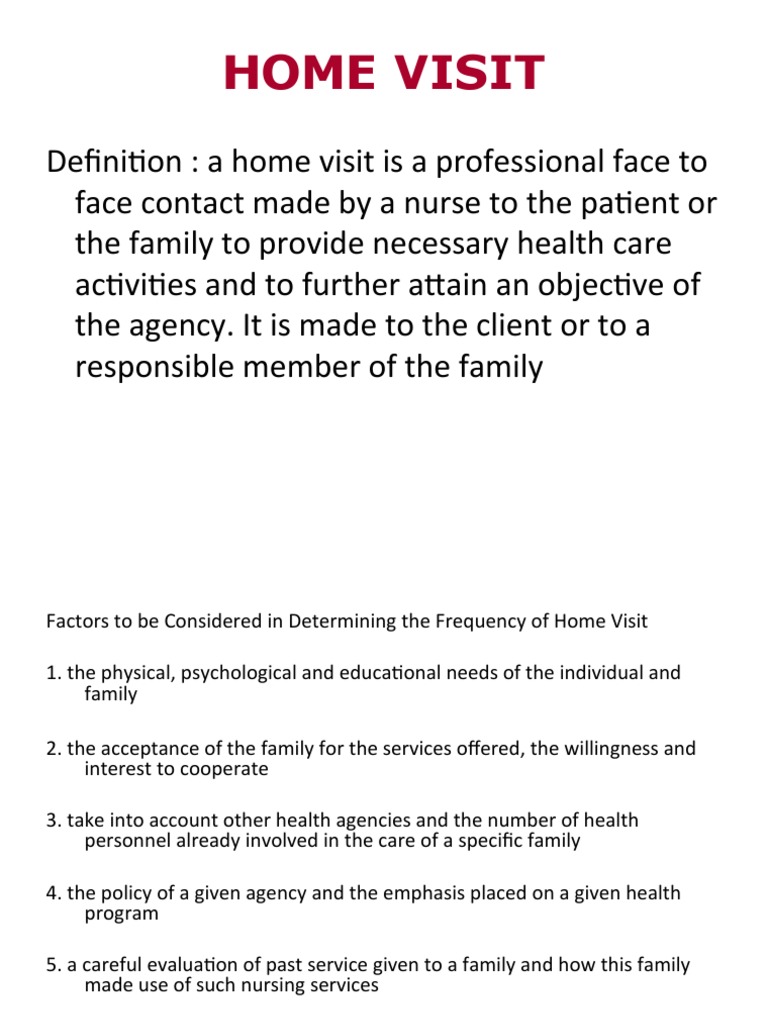 En español Nursing homes and other longterm care facilities have started to gradually reopen to visitors, allowing residents to reconnect with their loved ones The federal government established benchmarks in midMay for state and local officials to determine when nursing home visits could resume, but urged “extreme caution” and said the facilities should be “among the last to. HOME VISIT (should always have PURPOSE and OBJECTIVE) Is a professional face to face contact done by the nurse to the family Ø Factors Affecting Frequency of Home Visits o Physical/psychological and educational needs o Acceptance of the family (PRIORITY NEEDS). If you get services from a home health agency in Florida, Illinois, Massachusetts, Michigan, or Texas, you may be affected by a Medicare demonstration program Under this demonstration, your home health agency, or you, may submit a request for preclaim review of coverage for home health services to Medicare.