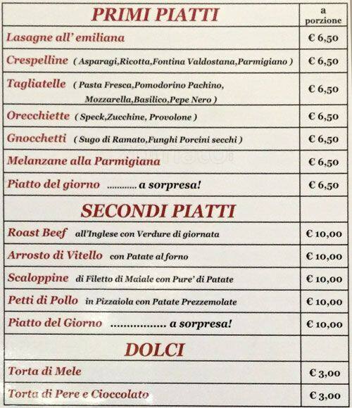 The Italian restaurant is located in the center of Brussels near Place Sainte Catherine in a historical house with small adjoining rooms, exposed beams and warm tones Italian cuisine, regional dishes and pizzas at the Center. Colazione inglese completa green salad insalata verde lasagne lasagne mixed grill grigliata mista mixed salad insalata mista pizza pizza poached eggs uova in camicia pork chops braciola di maiale roast beef roast beef roast chicken pollo arrosto roast duck anatra arrosto roast pork maiale arrosto salad insalata sandwich panino sausage and mash salsiccia e puré scampi scampi. Online menus, items, descriptions and prices for Primi Piatti Restaurant Jacksonville, FL 325.