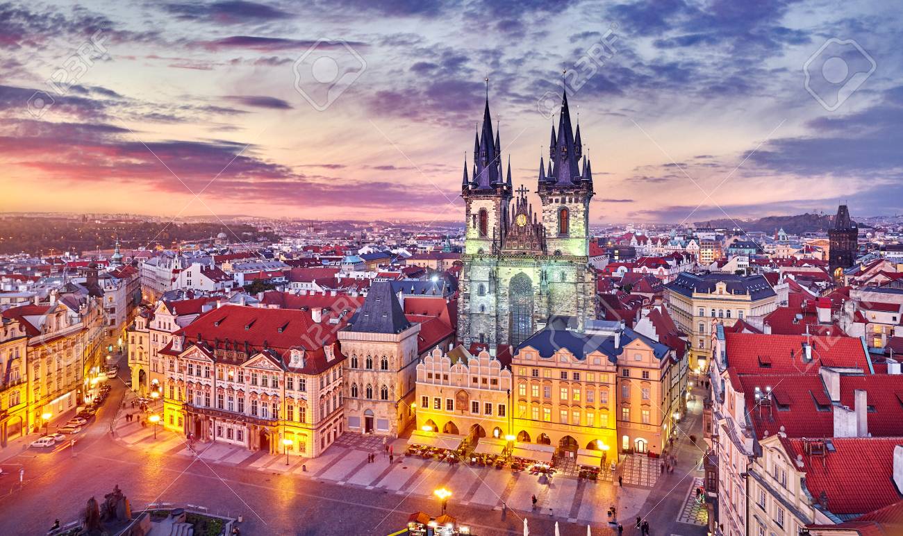 Immagini Stock Chiesa Di Nostra Signora Prima Di Tyn Sulla Piazza Della Citta Vecchia Praga Repubblica Ceca Con Il Tetto Rosso Cielo Al Tramonto E Vista Dall Alto Image