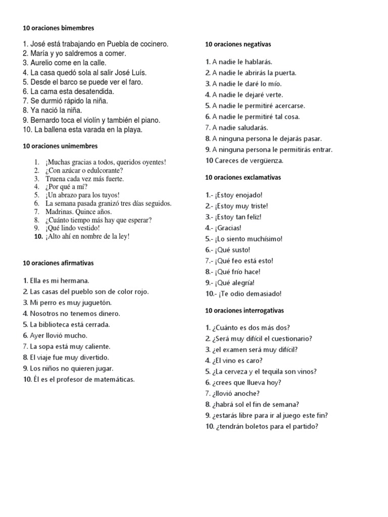 Era quebradiza y precisa, indicando sus temas en oraciones simples más bien que agregaciones torturous de cláusulas subordinadas Era croccante e rende paricolare, dichiarando i relativi temi nelle frasi semplici piuttosto che le aggregazioni torturous delle clausole secondarie. 10 oraciones Afirmativas 1 2 3 4 5 6 7 8 9 10 El sol sale de da Maana habr exposicin en el Auditorio El Almuerzo estar listo a las 1130 am Sandra tiene. Spanish Colecciona alrededor de 000 oraciones al día y ha ido corriendo por un año y medio aproximadamente, habiendo coleccionado mas de 10 millones y medio de sentimientos more_vert open_in_new Enlace a fuente.